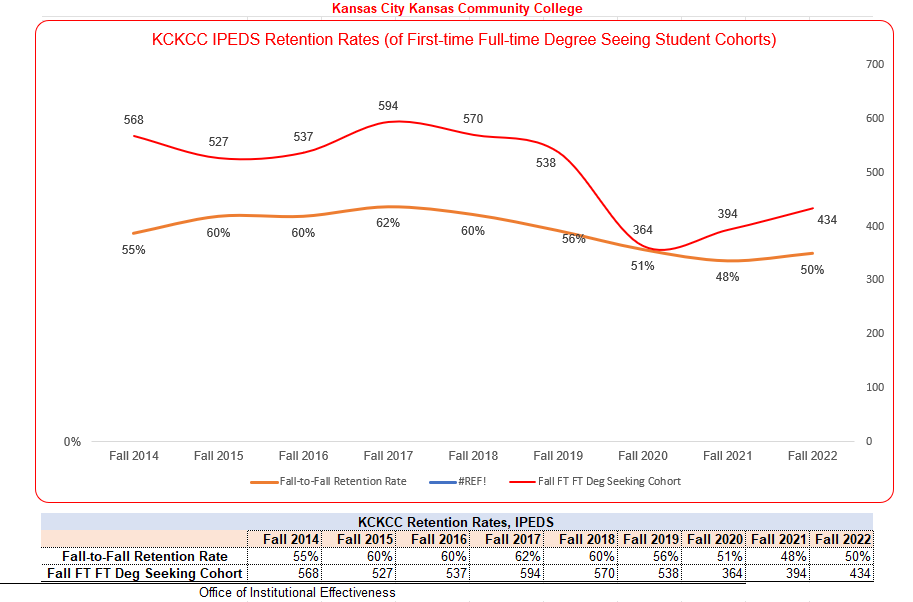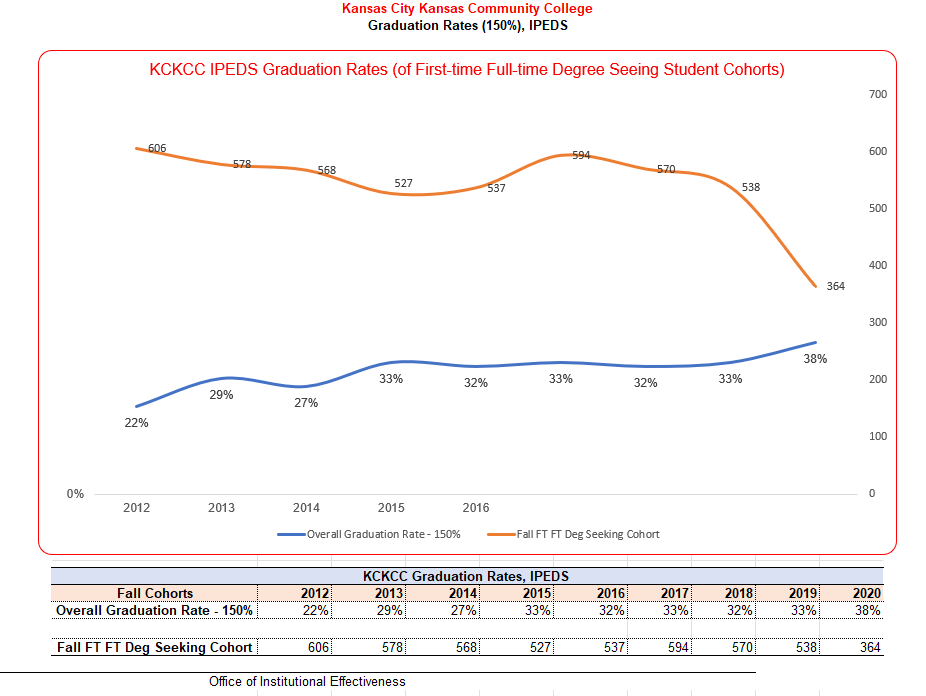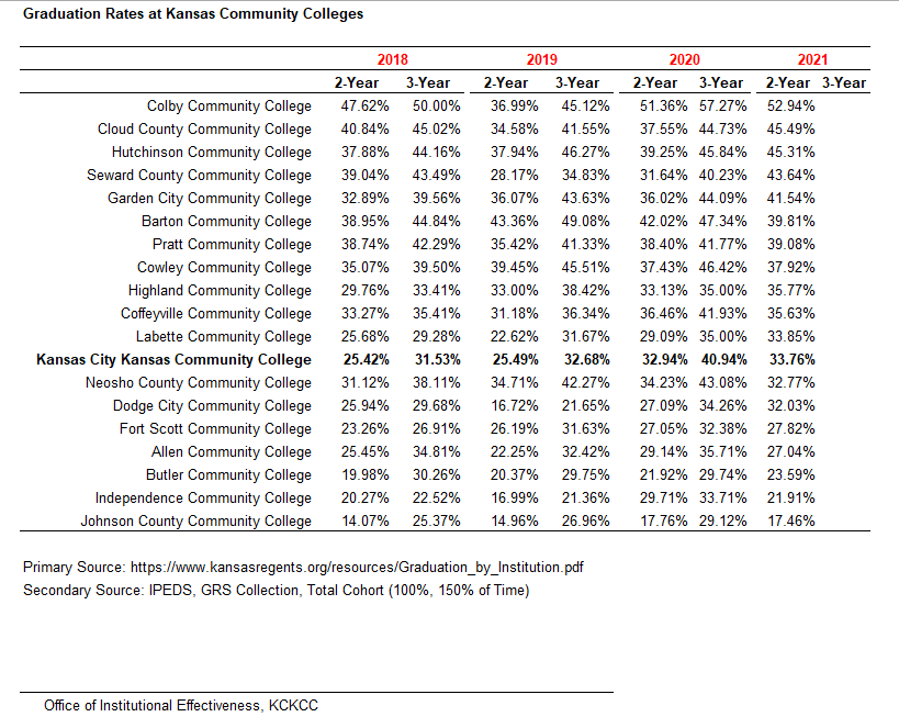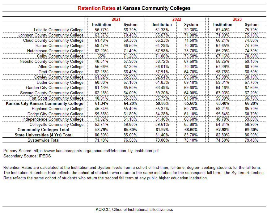 To fulfill state and federal data disclosure requirements, KCKCC reports the following consumer data, which include disclosure of graduation or completion rates and (transfer-out rates for some schools) for graduation, retention and transfer rates of general population of full-time, first-time degree or certificate-seeking, undergraduate students. (34 CFR 668.45)